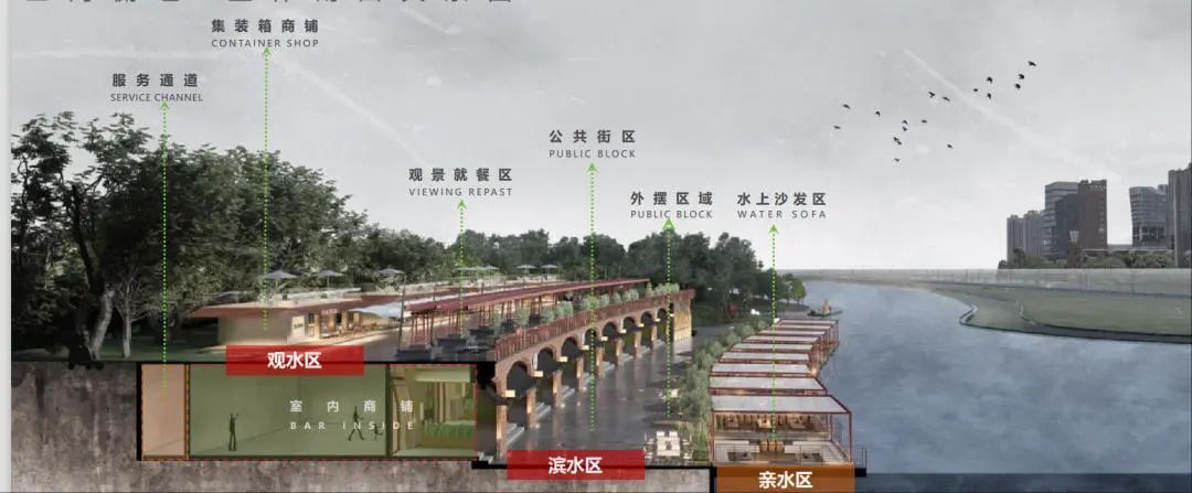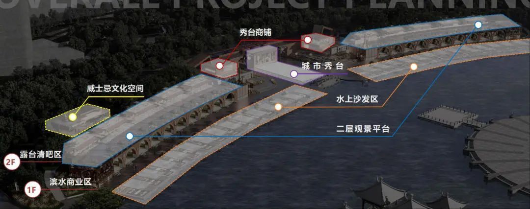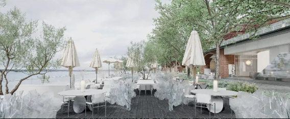 在亲水观景区中,则增加了沿岸休闲外摆,变身宽阔的水上平台,可容纳几列餐桌。