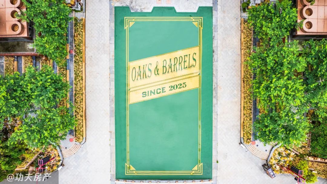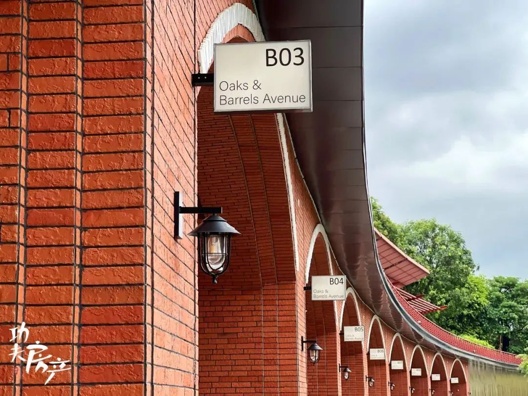 两条连廊中间铺上地板,写着“OAKS&BARRELS since 2025”,从高空看仿佛一瓶酒的瓶身标贴。首层原有的商铺门头被漆成砖红色风格,旁边的阶梯也用Whisky的英文加以装饰,欧式复古风迎面扑来。